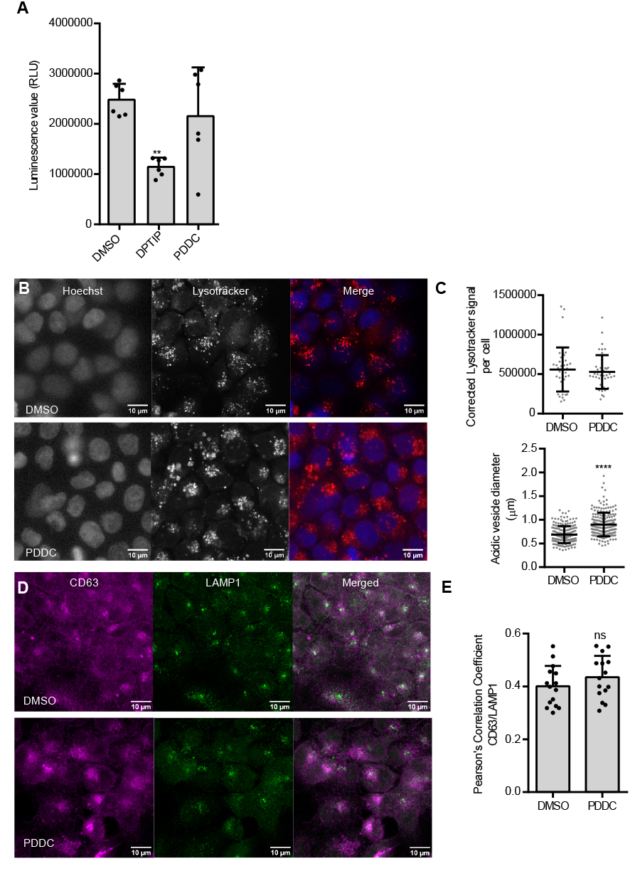 Here, we tested the effects of nSMase2 inhibitors PDDC and DPTIP on EV secretion from HCT116 colon cancer cells and HeLa cervical cancer cells. The results from our initial study show that PDDC and DPTIP differentially affect cell viability and EV marker secretion and moreover indicate that these inhibitors have previously undescribed effects on lysosomal and autophagic degradation pathways, that need to be considered. Similar to GW4869, cell type specificity seems to play a role that can be explored to unravel mechanisms of EV biogenesis and secretion.