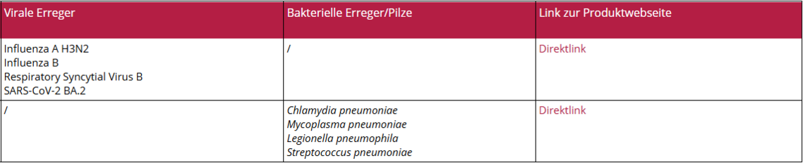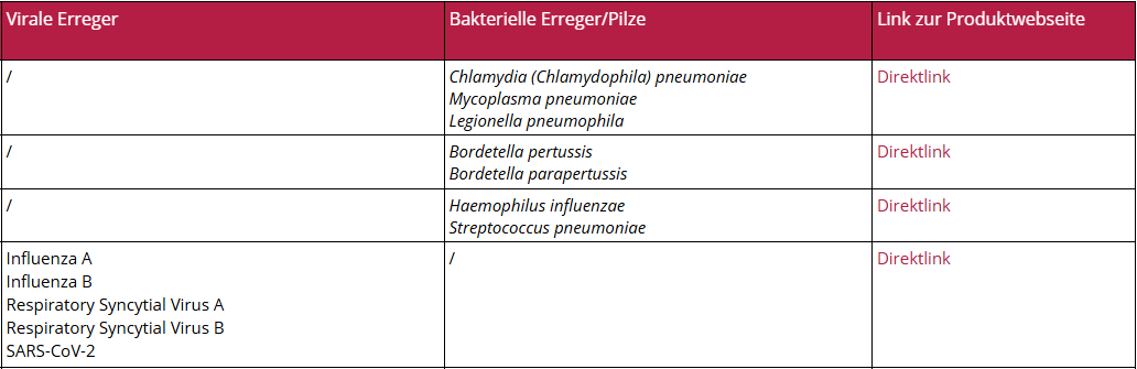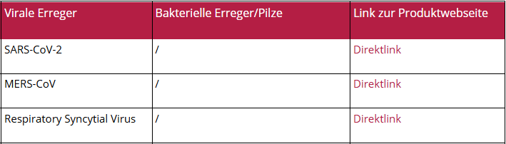 Im Folgenden finden Sie eine Auswahl von Assays und Qualitätskontrollmaterialien für die In-vitro-Diagnostik von respiratorischen Infektionen. Die Liste ist gegliedert in NAT-Verfahren, Antikörpertests und Qualitätskontrollmaterialien.
