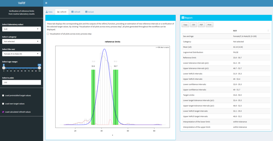 VeRIf ist eine interaktive Shiny-Webanwendung zur Verifikation und Bewertung von Referenzintervallen auf Basis von Routinelabordaten mithilfe vom R-Paket reflimR. Die Webanwendung unterstützt medizinische Laboratorien dabei, bestehende Referenzintervalle effizient, transparent und datenbasiert zu überprüfen.