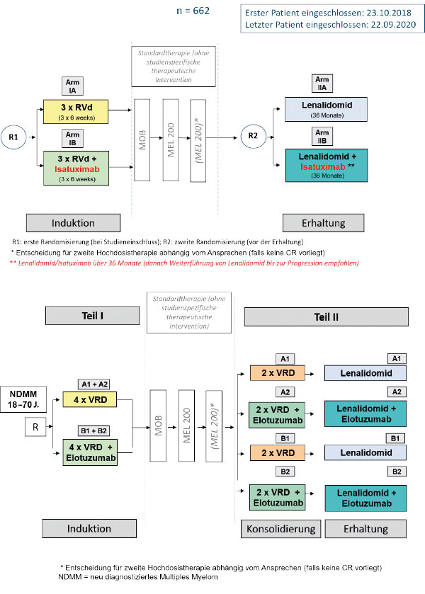Zusammenfassend zeigen alle drei Studien, dass eine Behandlung mit Proteasom-Inhibitor (PI) und Immunmodulator (IMiD) in Kombination mit einer ASZT der alleinigen Therapie mit einem PI und IMiD überlegen ist. Die ASZT ist daher nach wie vor der Goldstandard für die Behandlung des neu diagnostizierten MM. Aktuelle Studien sind in Tab. 1 zusammengefasst.