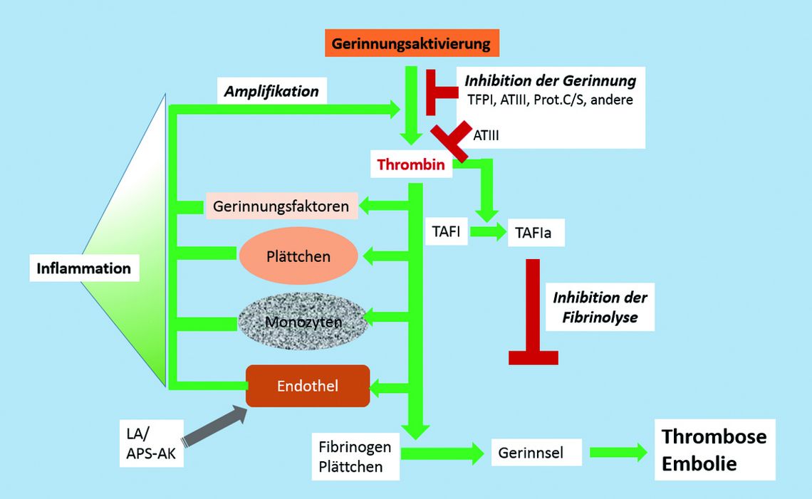 Thrombosen entstehen aus der Interaktion von Gerinnungsfaktoren, Blutzellen und Gefäßwand (vereinfachte Darstellung). Die Abkürzungen sind in der Tabelle und im Text erklärt.
