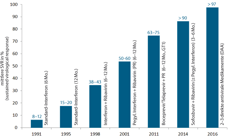 Bereits vor der Entdeckung des Hepatitis-C-Virus im Jahre 1989 wurden Patienten mit erhöhten Leberwerten, bei denen man eine Non-A-non-B-Hepatitis vermutete, erfolgreich mit Interferon behandelt. Die Transaminasen stiegen jedoch nach Ende der Therapie wieder an. In den 2000er-Jahren wurde das täglich zu injizierende Interferon durch die pegylierte Form (PEG-IFN-alpha) mit wöchentlicher Gabe abgelöst. Ohne den Wirkmechanismus bis heute erklären zu können, profitierten Patienten durch die zusätzliche tägliche Gabe des Nukleosidanalogons Ribavirin. So ließ sich die Heilungsrate zu Beginn des neuen Jahrtausends auf über 50% steigern (Abb. 1). Dies gelang jedoch nur mit einer nebenwirkungsreichen und über sechs bis 18 Monate dauernden Behandlung.