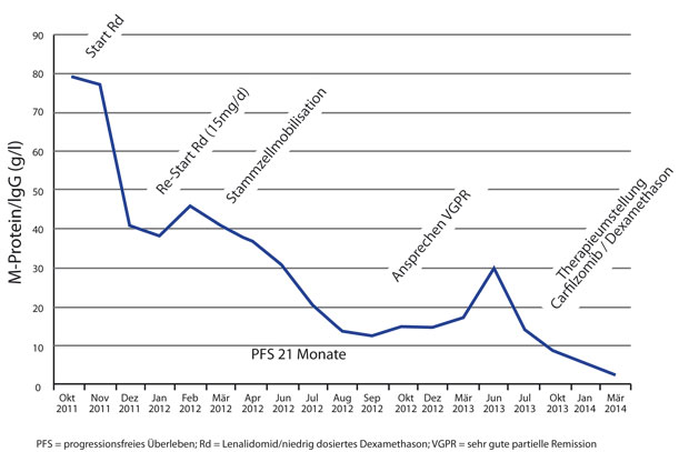 Im Dezember 2011, am Tag 8 des zweiten Zyklus Rd wurde bei dem Patienten eine kutane Reaktion vom Grad 3 diagnostiziert, weshalb die Lenalidomid-Therapie pausiert und systemische und topische Steroide und Antihistaminika gegeben wurden. Nachdem die Hauterscheinungen im Januar 2012 komplett abgeklungen waren, wurde die Medikation mit reduzierter Lenalidomid-Dosis (15 mg/d) wieder aufgenommen. Hierunter traten keine weiteren kutanen Veränderungen auf. Bezüglich der Grunderkrankung kam es zu einem guten Abfall des M-Proteins mit Erreichen einer sehr guten partiellen Remission (VGPR) im September 2012 (Abb. 2). Bis Juni 2013 wurde die Therapie insgesamt gut vertragen, allerdings wurde zu diesem Zeitpunkt ein serologischer Progress beobachtet, weswegen die Therapie im Rahmen der Studie beendet wurde. Aufgrund eines weiteren Anstieges des Paraproteins (Abb. 2) wurde eine erneute Studientherapie in der Kombination aus Carfilzomib und Dexamethason begonnen, unter welcher der Patient sich aktuell weiterhin in einer guten Remission befindet.