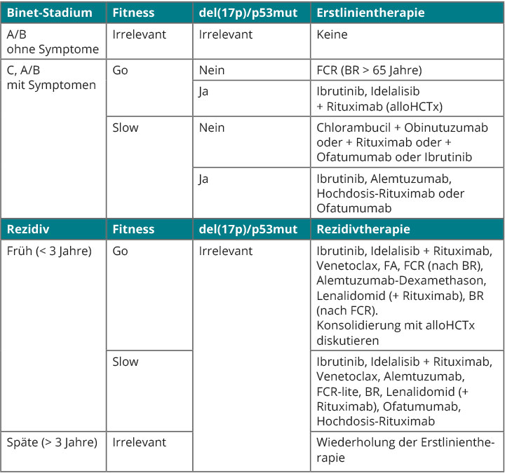 Vor einer Rezidivtherapie sollte aufgrund der möglichen genetischen Evolution der Erkrankung und des damit verbundenen möglichen Neuauftretens einer prognostisch ungünstigen genetischen Veränderung die zytogenetische und molekulargenetische Testung wiederholt werden. Finden sich hierbei keine neu aufgetretene del(17p) bzw. TP53-Aberration, ist für die Wahl der Rezidivtherapie die Dauer der Remission nach Erstlinientherapie entscheidend: