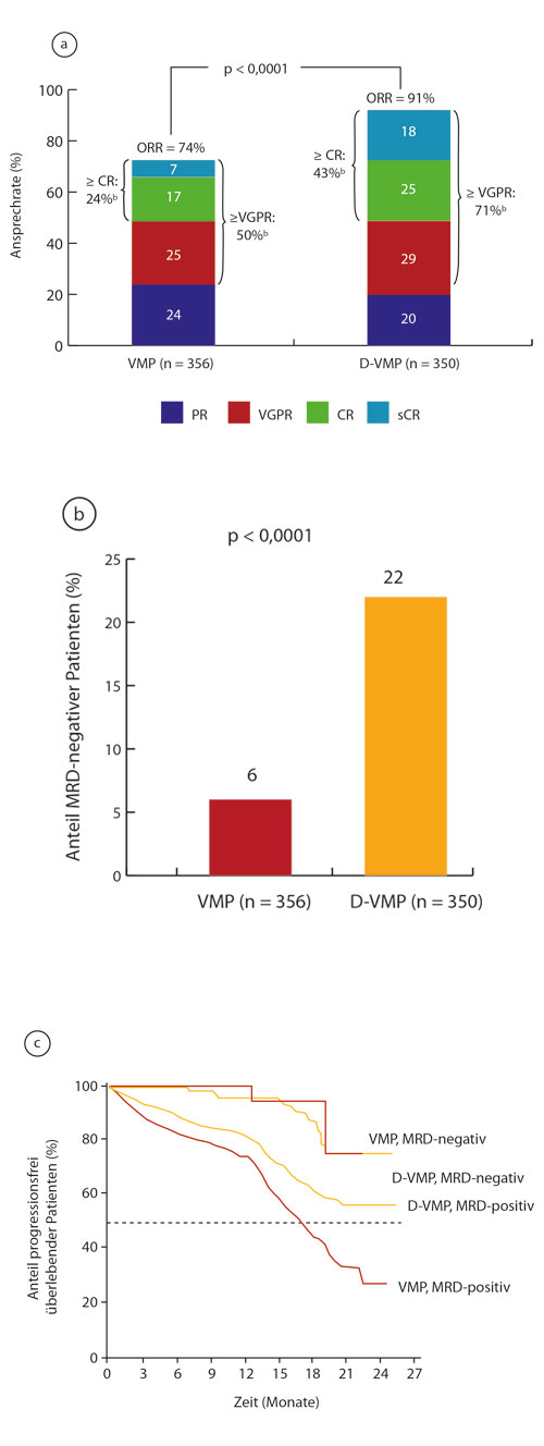 Beim progressionsfreien Überleben war der Vorteil durch die Dreierkombination weiterhin hochsignifikant mit einer rund 60%igen Reduktion des Risikos (Median unter DRd noch nicht erreicht, unter Rd 17,5 Monate; HR 0,41; p < 0,0001; Abb. 1a). Ebenso beeindruckend war der Unterschied beim Ansprechen mit Raten für das Gesamtansprechen von 93% versus 76% (p < 0,0001 Abb. 1b), für eine mindestens sehr gute partielle Remission von 79% versus 48% (p < 0,0001) und für eine mindestens komplette Remission von 51% versus 21% (p < 0,0001). Bei Patienten ohne nachweisbare minimale Resterkrankung (MRD; bei einer Sensitivität von < 10-5) war das progressionsfreie Überleben unabhängig von der vorangegangenen Therapie länger als bei MRD-positiven Patienten. Der wesentliche Vorteil der DRd-Therapie: Eine MRD-Negativität konnte damit mehr als viermal häufiger erreicht werden als mit Rd (bei 26% vs. 6% der Patienten; p < 0,0001).