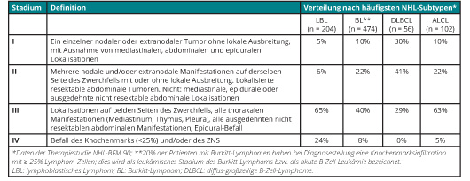 Die drei biologischen Hauptentitäten der NHL bei Kindern und Jugendlichen: B-NHL einschließlich B-ALL und diffus-großzellige B-Zell-Lymphome (DLBCL); lymphoblastische NHL und ALCL bedürfen einer jeweils unterschiedlichen und dem jeweiligen Ausbreitungsstadium angepassten Therapie. Mehr als die Hälfte der NHL bei Kindern und Jugendlichen sind Burkitt-Lymphome (BL), einschließlich der B-ALL und der DLBCL. In den ersten Therapiestudien der BFM (Berlin-Frankfurt-Münster)-Gruppe wurden Kinder und Jugendliche mit NHL identisch behandelt wie Kinder und Jugendliche mit ALL [1], das heißt mit einer intensiven Induktions-Polychemotherapie, gefolgt von einer intensiven Re-Induktions-Polychemotherapie und einer oralen Erhaltungstherapie bis zu einer Gesamttherapiedauer von 24 Monaten [2]. Es stellte sich bald heraus, dass diese Therapiestrategie sehr gute Behandlungsergebnisse für lymphoblastische NHL ergab, die im selben Bereich lagen, wie die Therapieergebnisse der ALL. Bei der größten Patientengruppe im Kindes- und Jugendalter, den Burkitt-Lymphomen, erbrachte diese Therapiestrategie jedoch eine deutlich schlechtere Prognose. Daher beschloss die BFM-Gruppe in den 1980er-Jahren eine Trennung der Therapieprotokolle für ALL und für NHL, wobei die B-ALL mit komplettem B-Immunphänotyp identisch behandelt wurden wie Burkitt-Lymphome im Stadium IV [3].